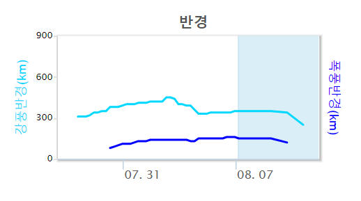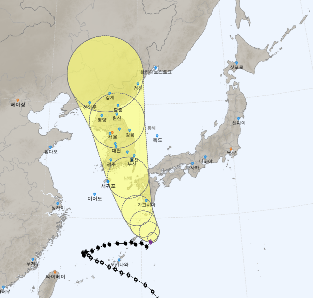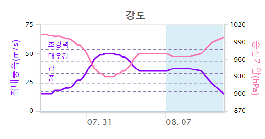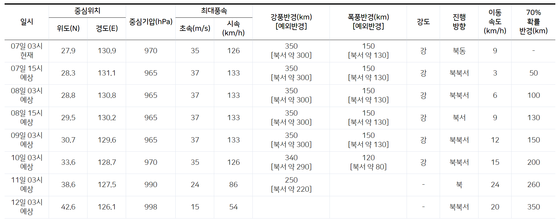 태풍 강도는 10일 낮 부산에 도달한 후 대구까지 내륙을 훑으면서도 ‘중’인 상태를 유지할 것으로 보이는데요, 이렇게 계속 북한까지 북상하겠습니다. 참고로 태풍 강도 ‘중’은 최대 풍속이 초속 25m~33m로 지붕이 날아갈 정도의 세기라고 보시면 됩니다.