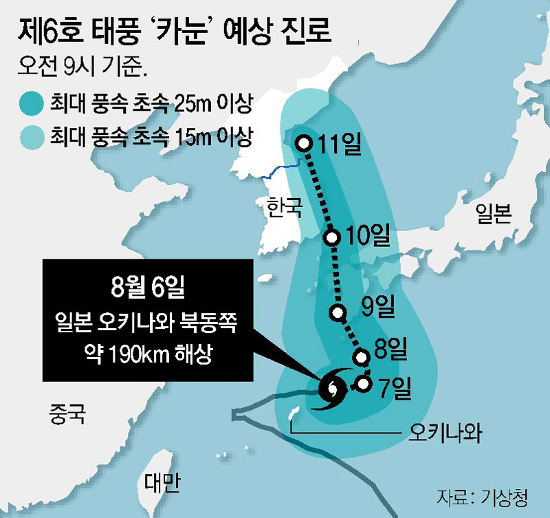 현재 일본 규슈 남쪽 해상에서 진행하고 있는 6호 태풍 카눈 예상 경로 진로는 점차 북진하면서 10일 오전에 경상 해안에 상륙할 것이라는 전망입니다. 태풍 카눈은 월요일부터 방향을 북쪽으로 틀것으로 보이는데요, 일본 규슈 서쪽 해상을 통과한 뒤 수요일 밤에는 동해로 진출해 목요일 오전쯤 부산 인근 경남 해안에 상륙하는 것이 현재 예상되는 카눈 진로입니다. 이후 영남과 강원도를 남북으로 가로지르면서 카눈이 북한 지방까지 북상할 것이라는 예보입니다.