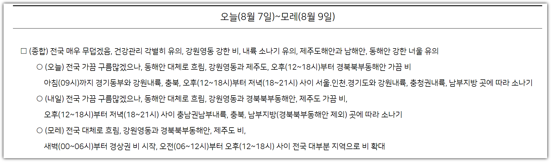 카눈이 북상하면서 따뜻하고 습한 공기를 몰고옵니다. 이에 따라 이번 주에도 폭염은 꺾이지 않을 것으로 보이는데요, 7~8일에는 낮 최고기온 35도를 기록하겠으며, 9일까지 전국 대부분 최고 체감온도가 35도 안팎까지 오르는 등 태풍 영향권에 들기 전까지는 무더위가 계속 될 것으로 보입니다.
