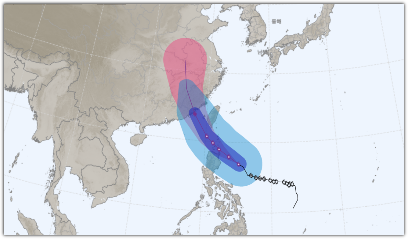 25일(화) 15시 기준 필리핀 마닐라 북동쪽 약 460km 부근 해상에 접근할 예정인데요, 오는 27일(목) 3시 경에는 타이완 타이베이 남남서쪽 약 510km 부근 해상에 접근할 예정이며 이후 30일(일) 3시 열대저압부로 변질되어 중국 푸저우 북북서쪽 약 700km 부근 육상에 접근할 예정인 것으로 알려졌습니다.