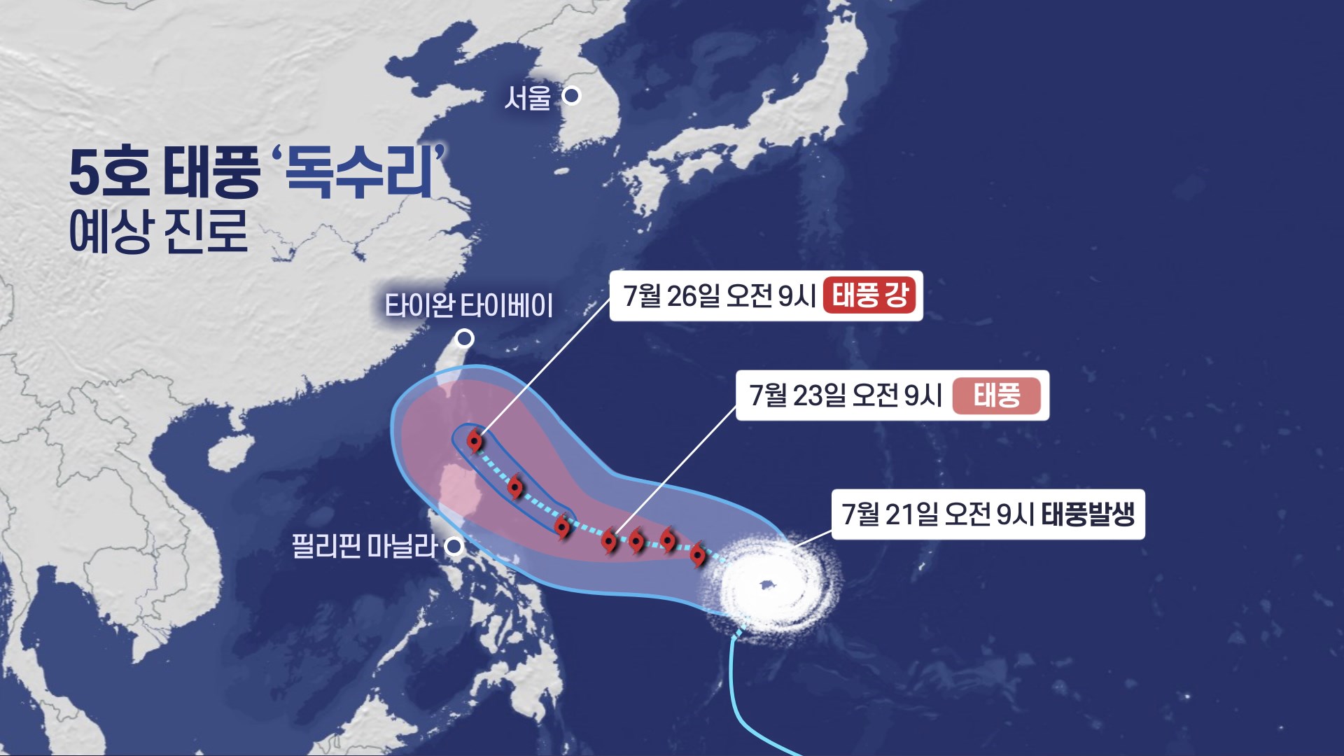 태풍 독수리는 이후 강한 세력을 유지한 채 목요일쯤 대만을 지나고, 주 후반엔 중국 푸저우 인근에 상륙할 태풍경로 현재위치를 예상해 볼 수 있는데요, 우리나라는 태풍과 다소 떨어져 있어 직접 영향은 없을 것이라곤 하지만 장마에는 큰 변수가 될 수 있습니다. 평년의 장마는 남부 7월 24일, 중부는 26일쯤 종료됐으나 태풍이 예상보다 서쪽으로 방향을 틀 경우엔, 비구름대가 내륙에 걸치게 되어 장마 종료 시점이 확실치 않은 상황이니 참고하시기 바랍니다.
