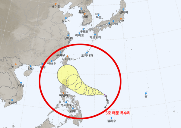 필리핀 동쪽 먼 해상에서 북상 중인 5호 태풍 독수리가 우리나라 장마에 영향을 줄 수 가능성이 있습니다. 현재 제5호 태풍 독수리 진로는 유동적이라고 볼 수 있는데요, 23일 기준 필리핀 동쪽에서 서쪽으로 서진 중이었는데 주 중반에 대만을 관통한 뒤 후반쯤 중국 남부로 들어갈 것이 전망되는 상황입니다. 이후 120시간 이내에 열대저압부로 약화될 것으로 예상되고 있습니다.