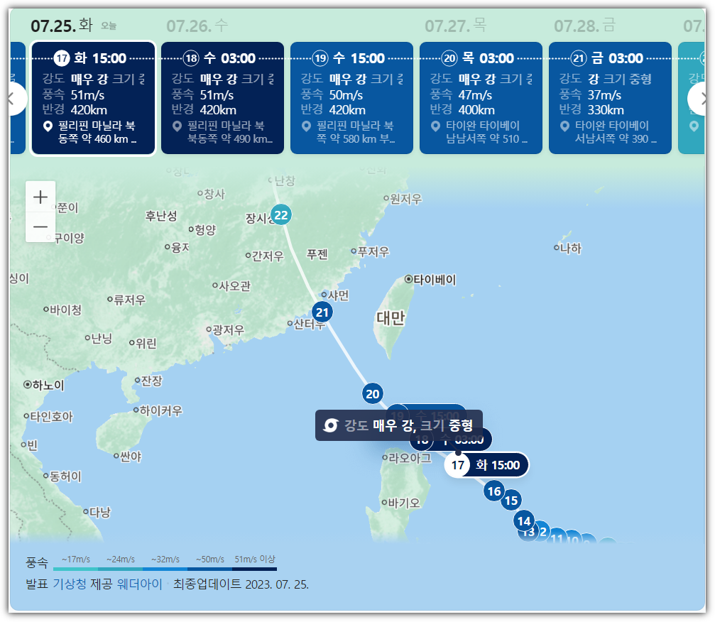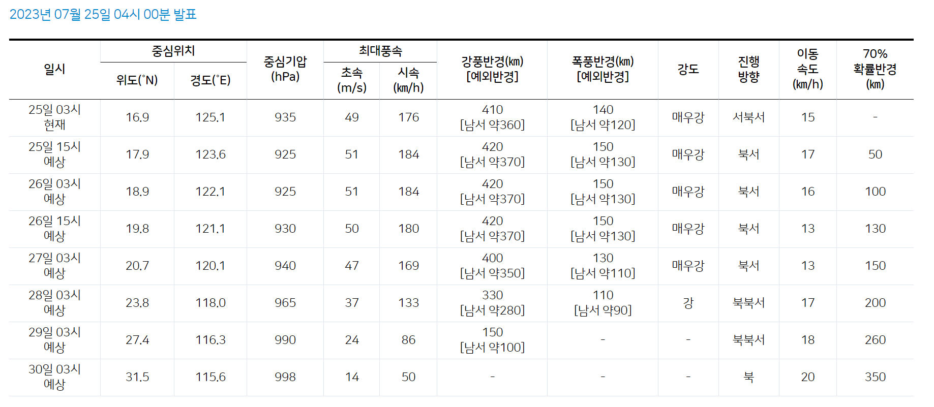 다만, 태풍경로 현재위치는 변할 수 있기 때문에 다음 발표를 주시해야 할 것 같으며 다음 발표는 25일 10시경에 예정되어 있습니다.