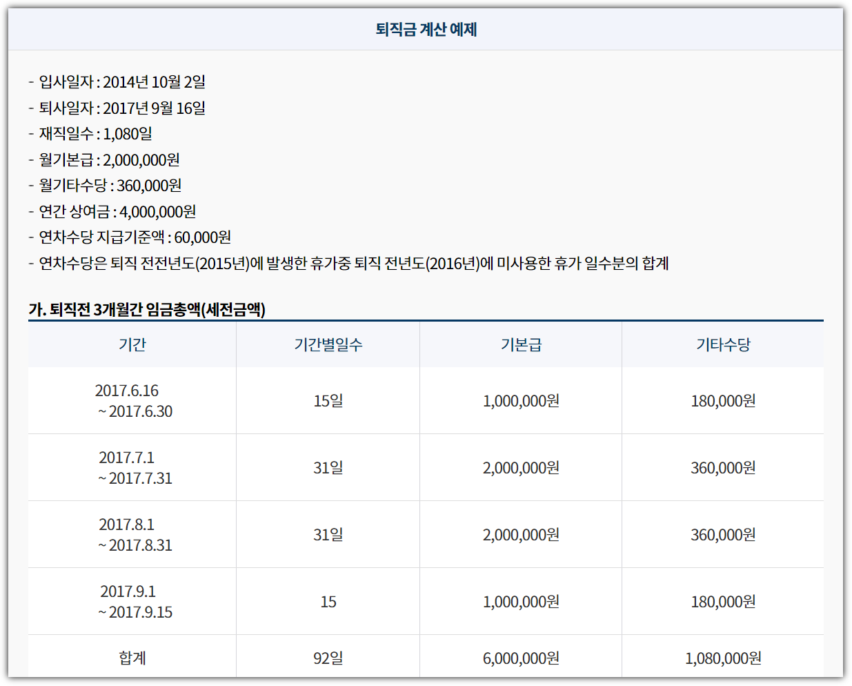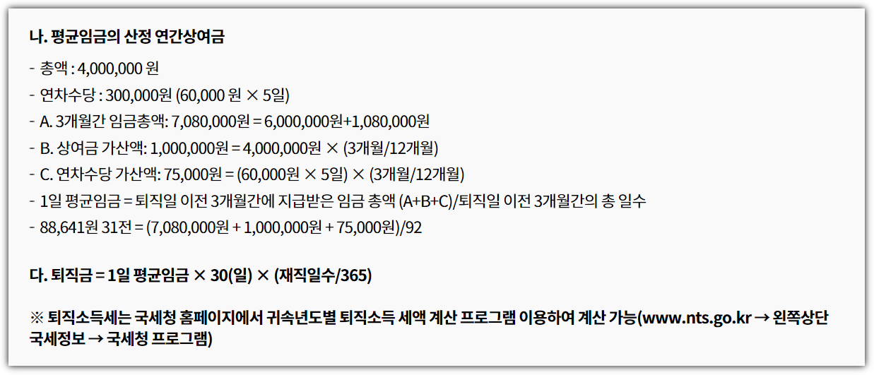 퇴직금 계산 방법은 퇴직일 이전 3개월동안의 입금총액과 퇴직 전일로부터 1년간 지급된 상여금, 퇴직 전일 1년내 사용하지 못해 지급받은 연차휴가수당을 합산해서 계산하게 되는데요, 퇴직금 계산기는 고용노동부 홈페이지에 상세하게 나와있습니다.