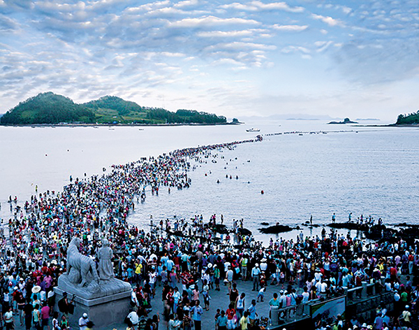 국가지정 명승 제9호 진도 신비의 바닷길은 고군면 회동리와 의신면 모도리 사이 약 2km 바다가 조수간만의 차이로 음력 2월 그믐날 수심이 낮아질 때 진도~모도 바닷길이 드러나는 현상으로 30~40m의 폭으로 활짝 펼쳐집니다. 매년 축제기간 이 현상을 보기 위해 수많은 국내외 관광객들이 진도를 방문해 바닷길이 완전히 드러나 있는 약 1시간을 만끽합니다.