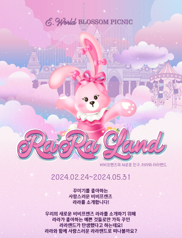 <스프링 페스티브 마켓>에서는 봄을 맛보는 다양한 블라썸 푸드와 감성 버스킹을 함께 즐길 수 있고 <라라의 로열 가든>에서는 이월드 대표 캐릭터 라라와 함께 특별한 공주로 변신할 수 있는 로열 드레스 부띠끄도 만나볼 수 있습니다. 이 외에도 라라와 비비프렌즈들을 만나볼 수 있는 그리팅과 라라의 블라썸 판타지, 로열 가면무도회 등 다양한 공연, 밤하늘을 수놓는 화려한 불꽃쇼 <이월드 인더스타즈>도 준비되어 있습니다.