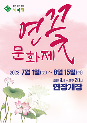 7월 1일부터 8월 15일까지 세미원에서 연꽃 문화제가 진행됩니다. 문화제 기간동안은 아침 9시부터 저녁 6시까지 휴일 없이 개장된다고 하는데요, 이 시기에 세미원의 자랑 연꽃이 한창 피어난다고 해요.