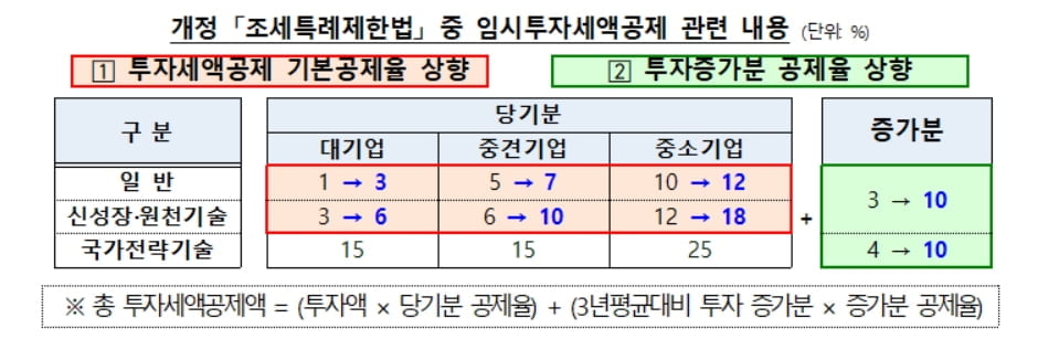 여기에 직전 3년간 연평균 투자 금액 대비 투자 증가분에 대해서는 올해에 한해 10%의 추가 공제(임시투자세액공제) 혜택도 제공된다는 내용입니다.
